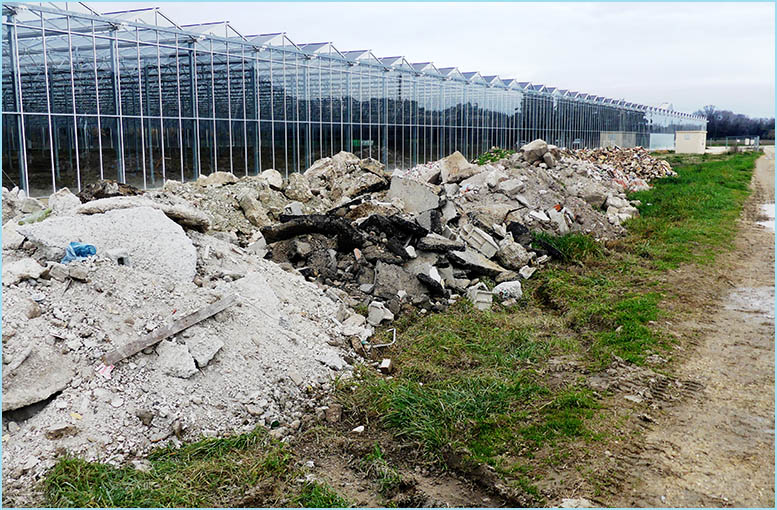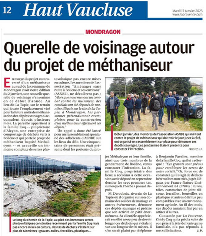 M. Deroubaix, riverain traiteur de La Tapie et organisateur de soirées pour mariages et autres, en pâtit énormément. Il reçoit régulièrement une clientèle qui apprécie peu cet environnement et l'oblige à longer ces gravats sur une longueur de 60 mètres. Il s'en est plaint par téléphone à M. Benjamin Favalier, membre de la famille Coq, qui lui a rétorqué : "Ces gravats sont prévus pour remblayer les serres de notre société." Or ces dépôts, jugés illégaux par France Nature Environnement 84 (FN84), n'ont pas bougé depuis quatre mois. Ils en auraient attiré d'autres. C'est ce qu'affirme la famille Coq, peu respectueuse de son voisin traiteur immédiat, adhérent d'ASNBE, qu'elle contraint à une perte de clients. J. P.