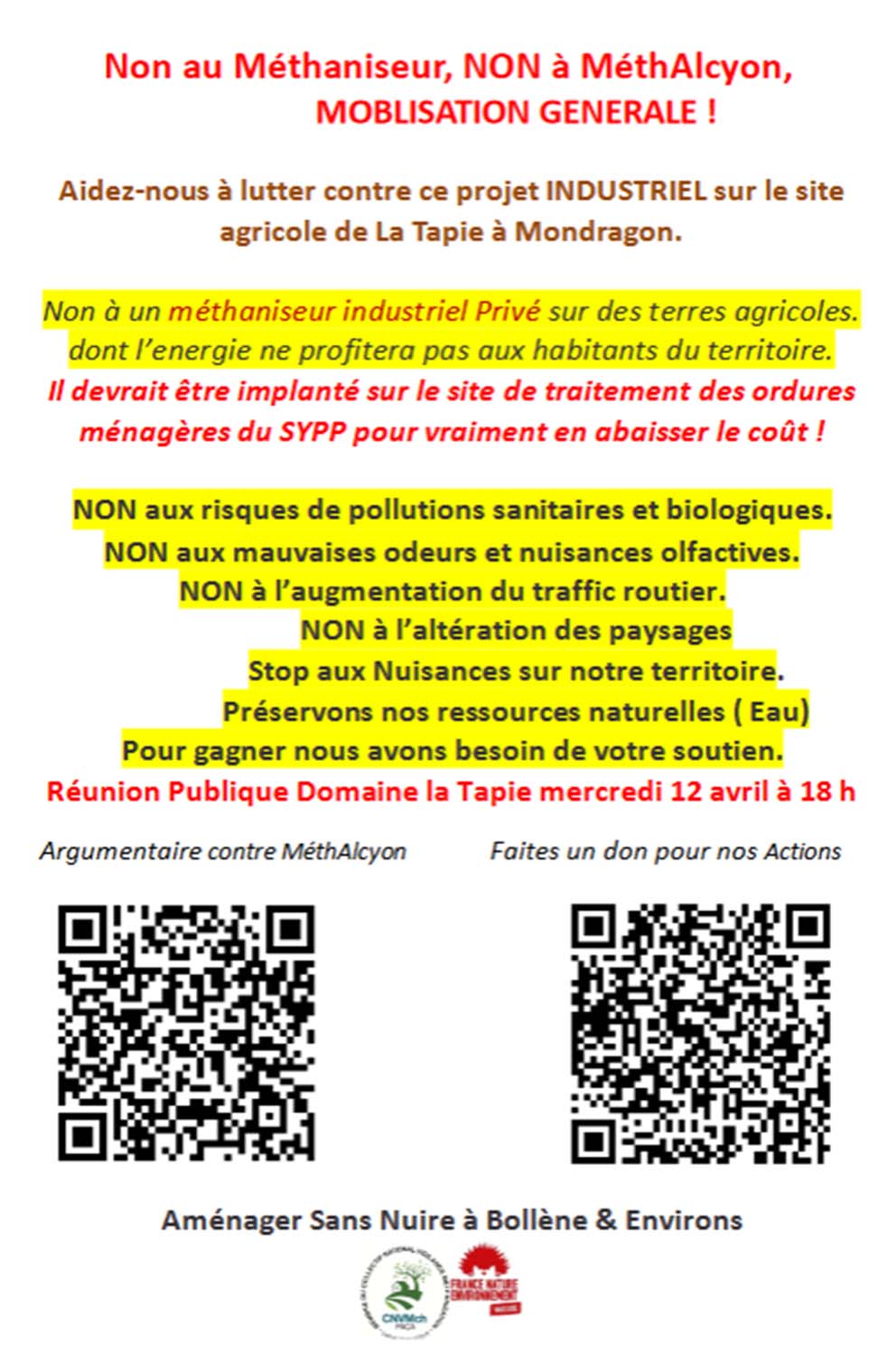 Environnement - Dimanche 2 Avril 2023 Non au méthaniseur et à MéthAlcyon ! Réunion à La Tapie Mercredi 12 Avril à 18 heures  |