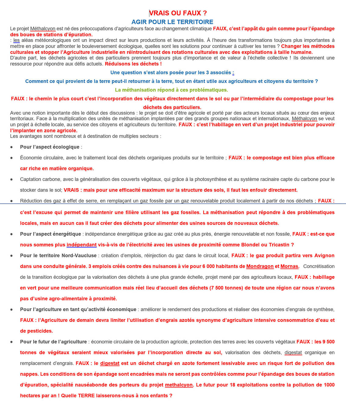 Avec l'appui de son bras droit Denis Maucci, voici l'essentiel de l'intervention du président Alain Rodriguez. "La méthanisation est un progrès par rapport à l'incinération. D'où l'utilité des unités agricoles dans les régions d'élevages ou industrielles et de valorisation des déchets. Oui pour l'implantation d'unités gérées par les collectivités locales sur des sites industriels. Pour le cas mondragonnais, le site du traitement des ordures ménagères du Syndicat des Portes de Provence à Roussas (26) semble très adapté. Non au projet Méthalcyon à Mondragon qui n'est pas agricole et n'a pas sa place sur les terres de La Tapie. Risques encourus : pollution des terres et de la nappe phréatique, infiltration par l'épandage des digestats, pollution des forages domestiques, insécurité routière par un flot continu de camions sur la Via Rhôna fréquentée par de nombreux cyclistes, altération du cadre de vie avec une verrue dans le champ visuel de la forteresse classée de Mornas, etc."