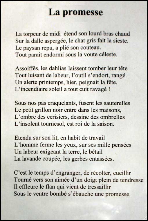 En l’absence de la photographe, sise à Bourgoin-Jallieu (excusée), seule la chansonnière du bonheur, sise à Bollène, nous confie sa joie d’être : « La poésie exalte les sentiments, à partir des événements de la vie : une naissance, un mariage, un deuil. J’ai commencé dès l’enfance. A l’école, je ne brillais guère en arithmétique, mais j’étais la reine pour les rédactions. Le pic se situe dans les années 80. Mes quatre enfants étaient grands, j’étais esseulée, les poèmes m’ont sauvée. J’en ai écrit plus 1200 ! ».
