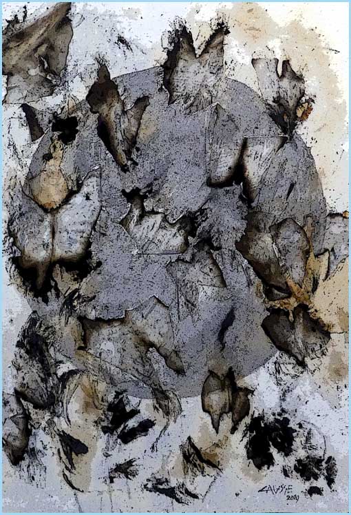 Ne se contentant pas du déjà vu, Causse rafraîchit éventuellement ce qu’il ressort de son officine par de nouveaux stigmates, comme le lui permettent ses techniques mixtes : peinture, collages, graffitis, etc. D’où ces camaïeux tactiles, ces aspects hiéroglyphiques, aux tonalités sobres mais rugueuses, où s’accumulent les misères du monde. Si la flamme n’intervient pas directement, elle reste inhérente aux sujets, symbolisés par des compositions abstraites : Papillons de nuit (qui se brûlent), 13 novembre 2015 (attentats), Terre en feu (incendie)…