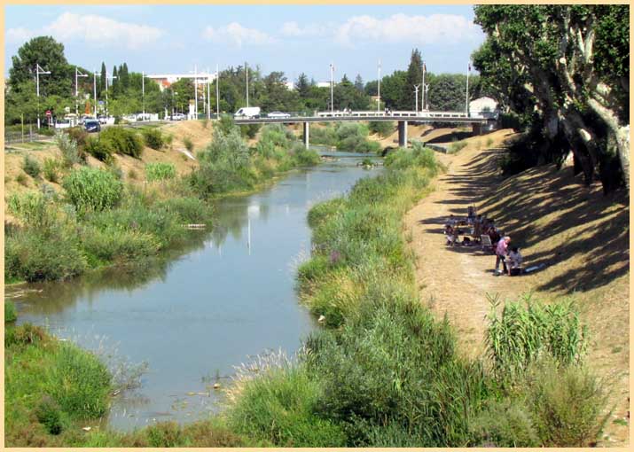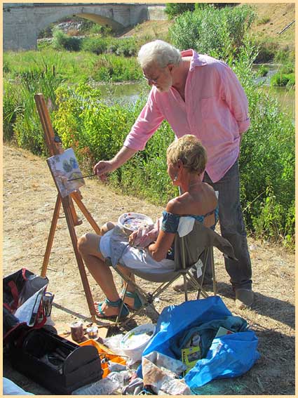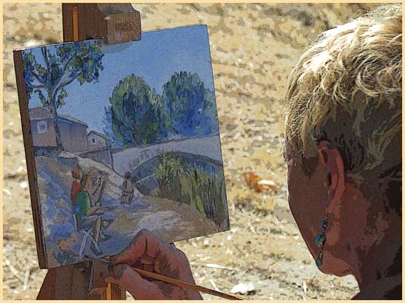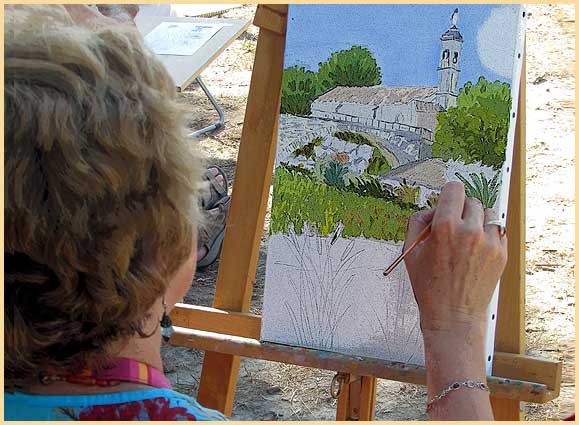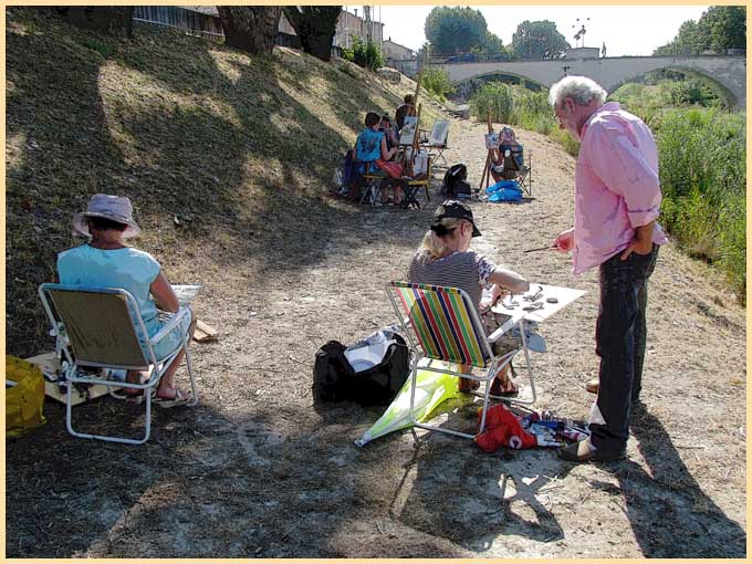 Au bord du Lez, dix peintres et leurs chevalets se côtoient à l’ombre, entre les deux ponts. Ils tournent tous le dos au pont de l’Europe, d’une architecture sans âme, et lui préfèrent le vieux pont en pierre de Chabrières, qui accapare tous les regards. La proximité de la chapelle de Notre-Dame du Pont, qui se reflète dans l’eau, ajoute à l’esthétique.