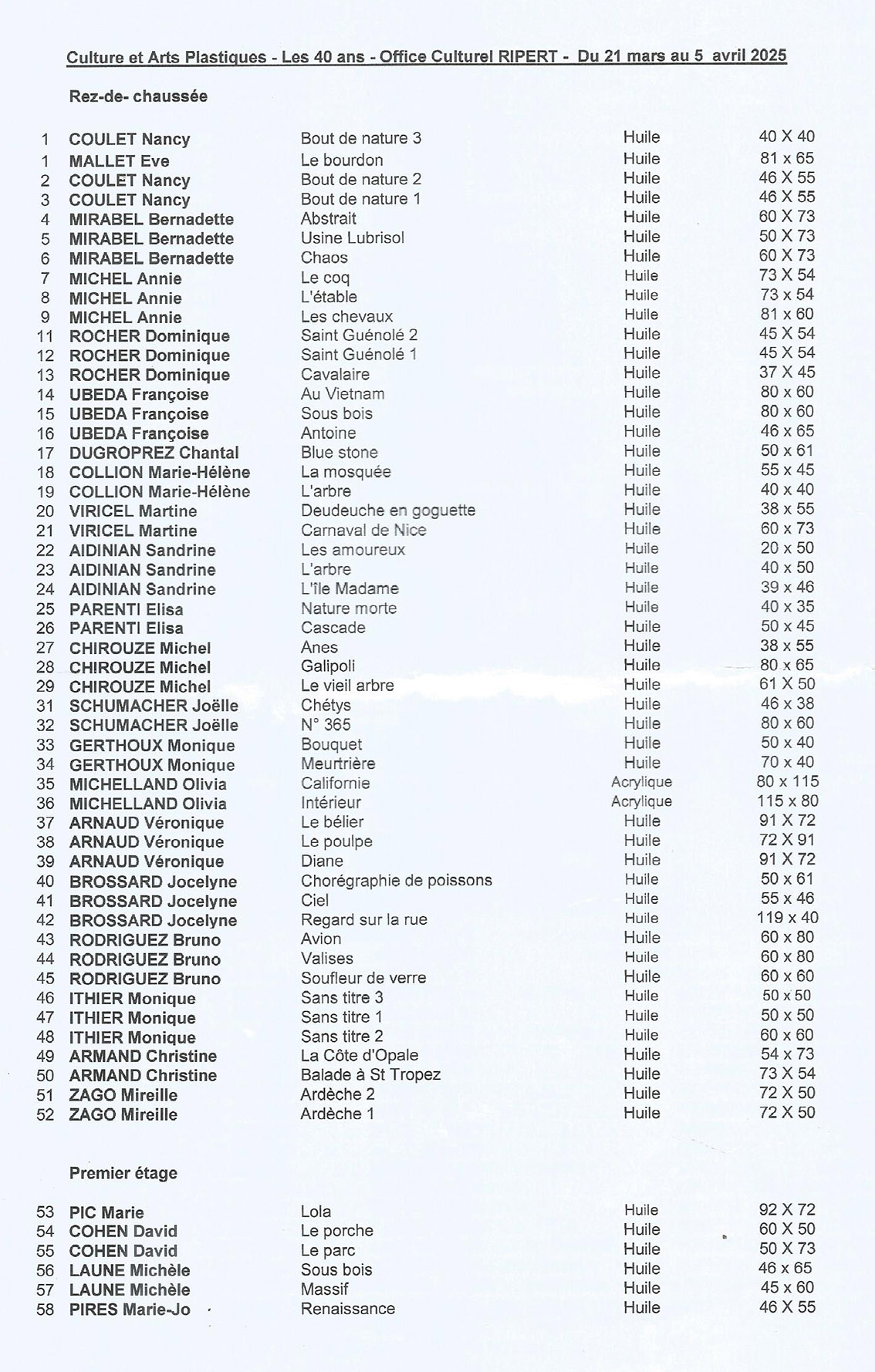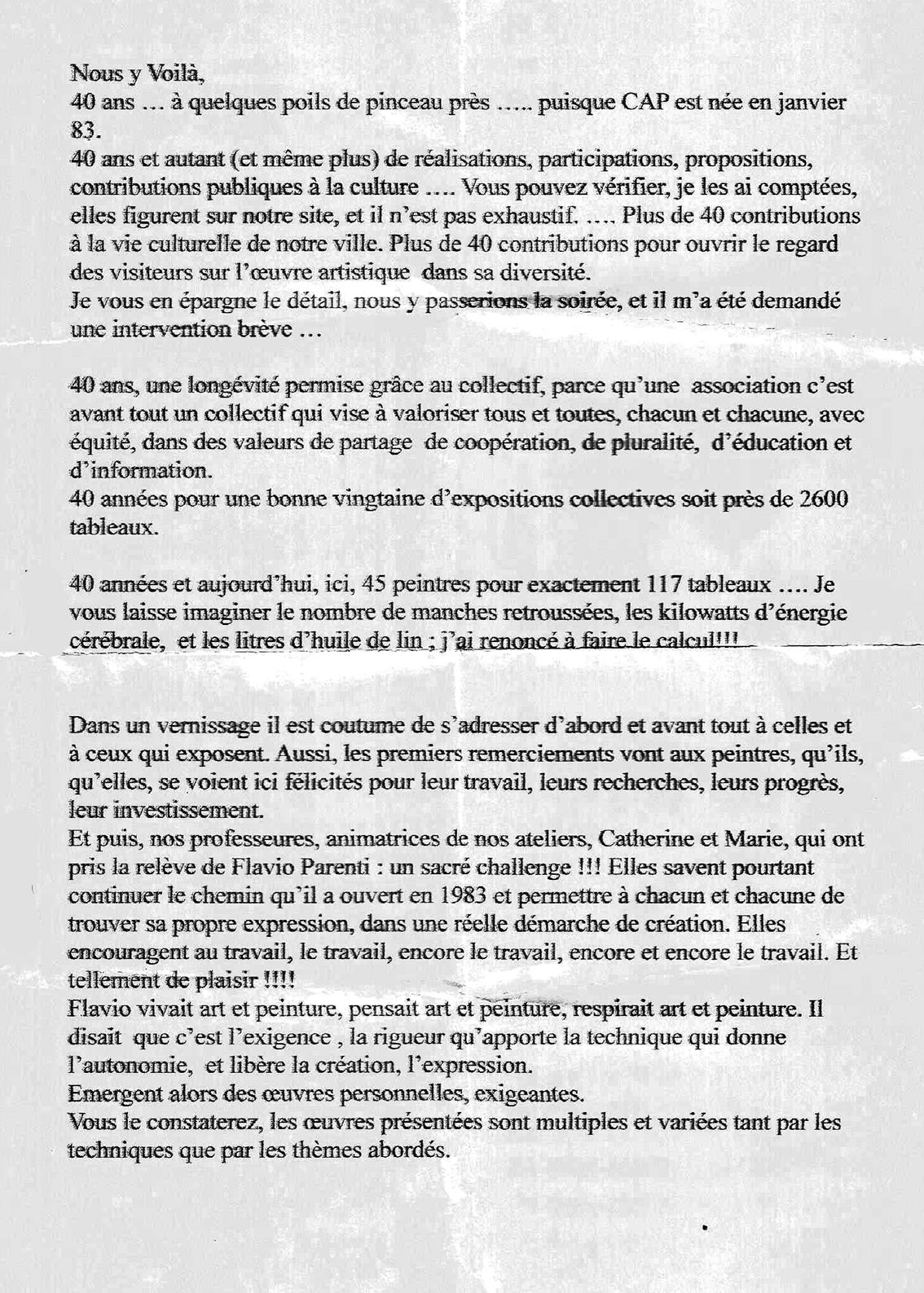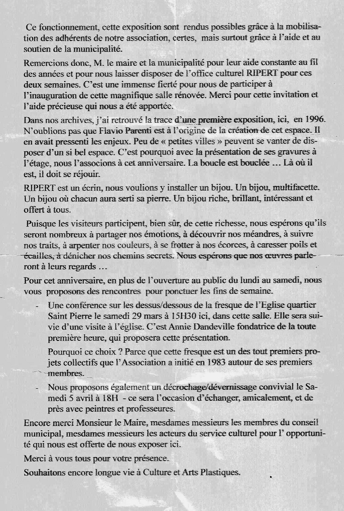 Exposition au nouvel Office culturel Ripert jusqu'au 4 avril (du lundi au vendredi de 15h à 18h). Autres rendez-vous, samedi 29 mars à 15h30 : Conférence par Annie Dandeville sur la fresque de l'église de Saint-Pierre(oeuvre collective de 1983). Samedi 5 avril à 18h : décrochage des œuvres et rencontre avec les exposants. J. P.