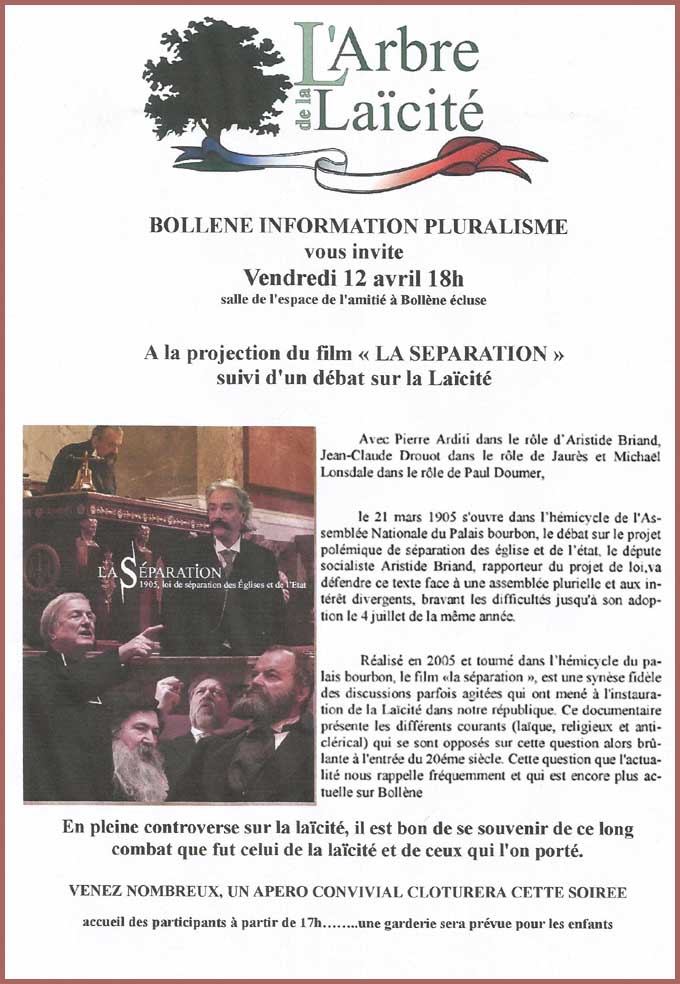 Entre deux de ses fêtes annuelles, généralement organisées en automne, la BIP (Bollène information pluralisme) vient de faire un coup d’éclat avec un débat axé sur « L’arbre  de la laïcité ». Les sympathisants ont fait le plein de  l’Espace de l’Amitié à Bollène-Ecluse. Une rétrospective sur la laïcité aligne des panneaux (fournis par Vivre en Europe et la Ligue de l’enseignement).
