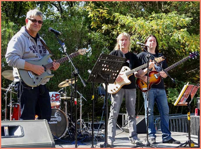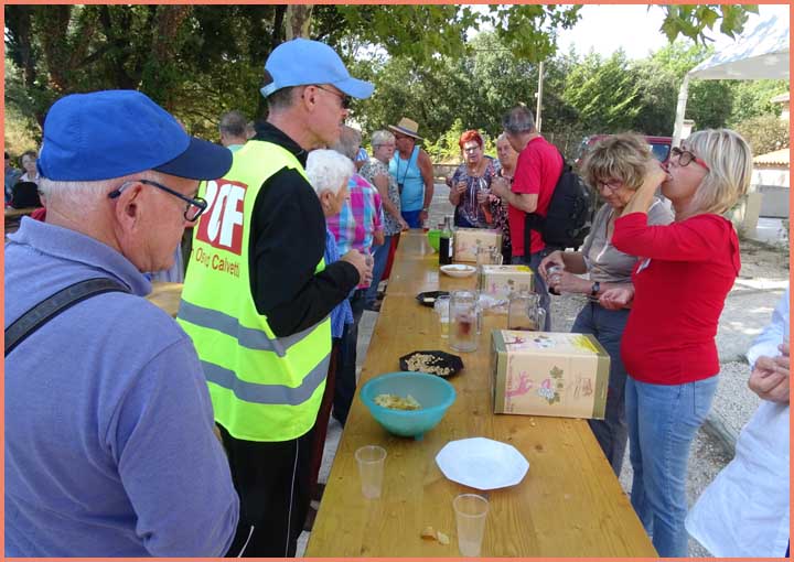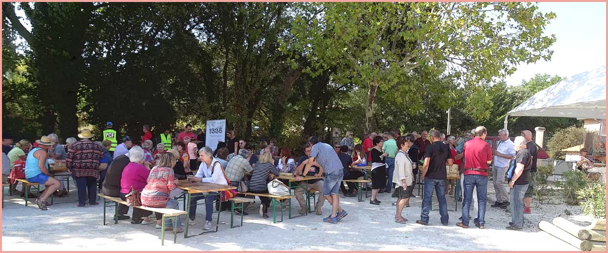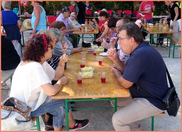 Vers midi, un cordial apéro a détendu l’atmosphère. Suivait un repas en plein air. Parallèlement au concours de pétanque, une après-midi musicale proposait trois concerts successifs : « Parfum de jazz » par le trio Core’Us (issu du conservatoire de Bollène), des reprises de Renaud et autres par le trio « Steph’ Chant’ Renaud » (cousin des Potos Acoustiques) et un condensé pop-rock par Les Incorruptibles.