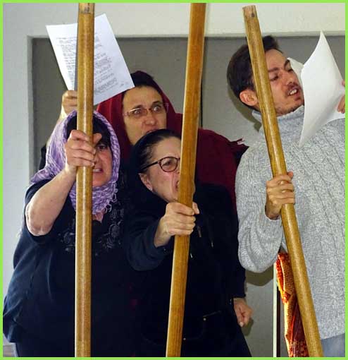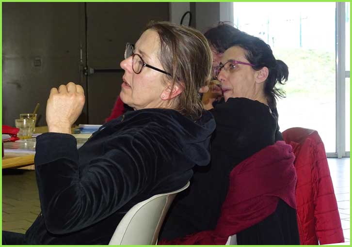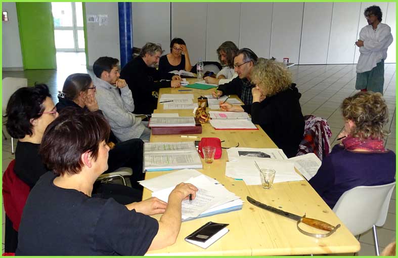 Peu séduite par son déménagement, Laetitia Hivin, présidente et comédienne, regrette, entre autres, « que des tags obscènes recouvrent les murs des tribunes et suggère à la mairie un stage créatif à partir des tags. » La Ville n’a pas relevé cette boutade, mais s’est tout de même montrée compréhensive. Exceptionnellement, pour des week-ends de répétitions, elle a mis à disposition l’espace de l’Amitié, à Bollène-Ecluse. C’est là que nous avons rencontré la troupe, en plein travail, axée sur son nouveau spectacle, toujours mis en scène par Frédéric Richaud (par ailleurs directeur artistique d’Eclats de Scènes).