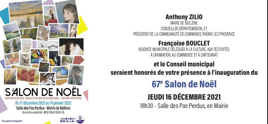 ![]() Exposition à l'hôtel de ville jusqu'au 12 Janvier 2024. Entrée libre. Ateliers gratuits pour enfants, animés par Delphine Delphine Balzano-Bringer : Mercredi 10 Janvier de 9h à 10h30 et de 13h30 à 15h. |