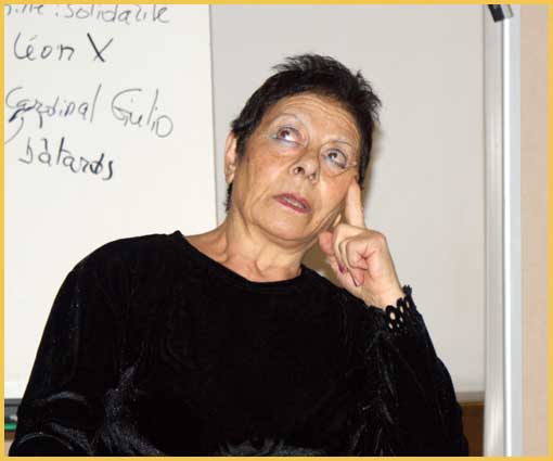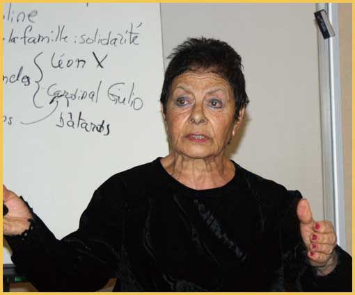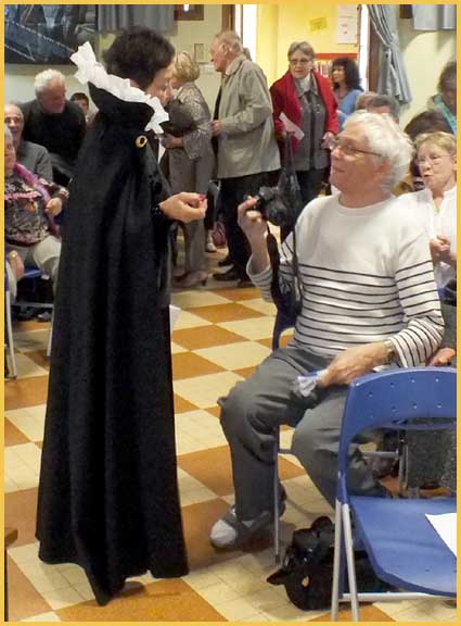 Le second volet, qui nous occupe ici, incombe à Mayram Bedin. Son tempérament volcanique n’est pas de tout repos pour l’auditoire, submergé deux heures chrono durant par son étourdissant bagout. Ménageant son entrée, voici qu’elle apparaît en longue robe noire, avec collerette blanche. Un saisissant mimétisme arrache un cri collectif : « Catherine de Médicis ! »