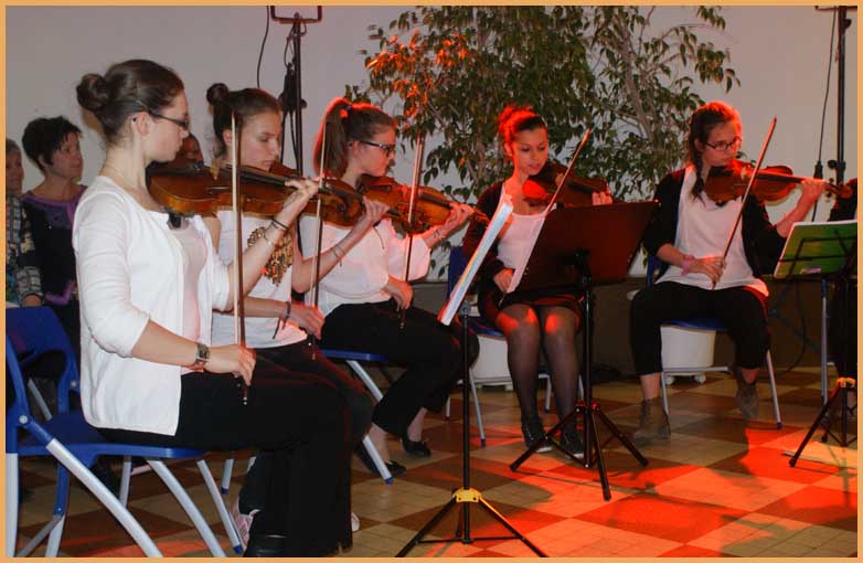 Yvon Durnez, prof de violon et alto au Conservatoire (et époux de Marie), a donc été sollicité. Il est venu avec ses meilleurs élèves, a enrôlé au passage deux violoncelles (dont le prof Emmanuelle Rauch), pour ponctuer des mini-récits à pas variables, à une ou plusieurs voix, à la manière de différents auteurs tels que Colette ou Aragon.
