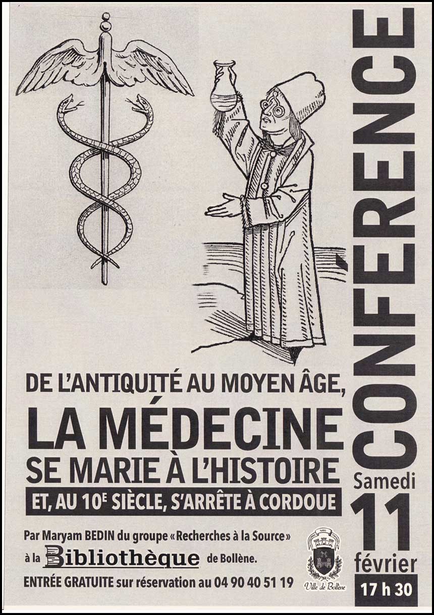 - Samedi  11 février : « De l’Antiquité au Moyen âge, la médecine se marie à l’Histoire » par Maryam Bedin.  Affiche