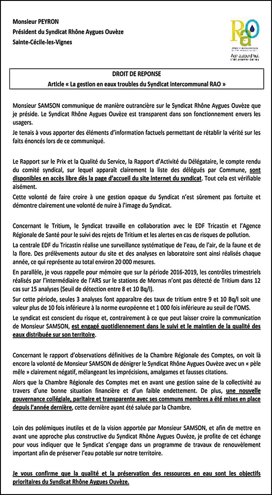 Christian Peyron (photo), président du Syndicat RAO, répond à l'article "Gestion des eaux troubles du Syndicat intercommunal" communiqué par Michel Samson (voir épisode précédent).