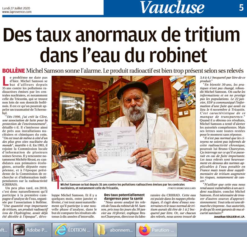 L’eau du robinet, prélevée en centre ville (rue de la Paix), contient en permanence du Tritium (hydrogène radioactif). Ce constat est effectué par le Bollénois Michel Samson, en relation avec la CRII Rad (Commission de Recherche et d’Information Indépendantes sur la Radioactivité). En mars dernier, il a déjà alerté les autorités locales, le Syndicat RAO (Rhône-Aygues-Ouvèze) et la Société SAUR, gestionnaire des réseaux de distribution d’eau.