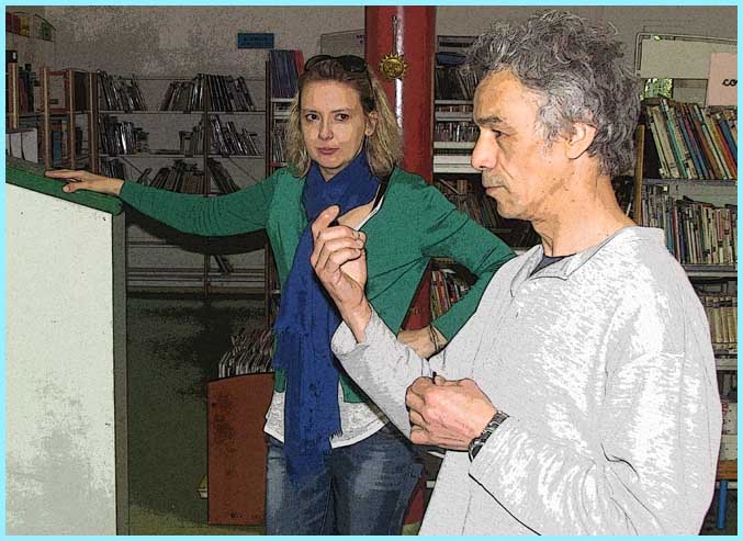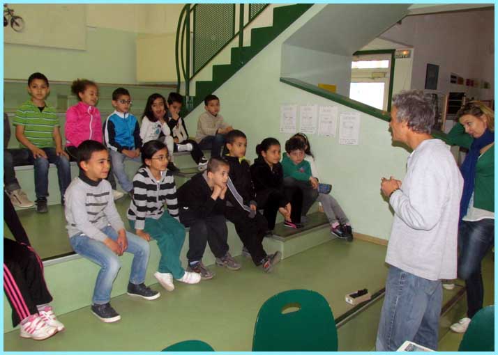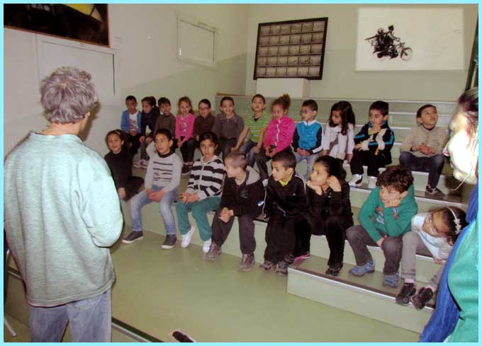 Durant une journée, quatre classes élémentaires ont successivement travaillé sur le thème du mouvement, illustré par une œuvre accrochée au mur : un motocycliste et son passager habilement esquissés en noir et blanc. Ce remarquable tableau monochrome est dû à Belkacem Boudjellouli, artiste peintre, établi à Sète, qui est aujourd’hui accueilli à Giono (il a déjà exposé à Bollène en 1996 via le Centre d’art du Crestet).