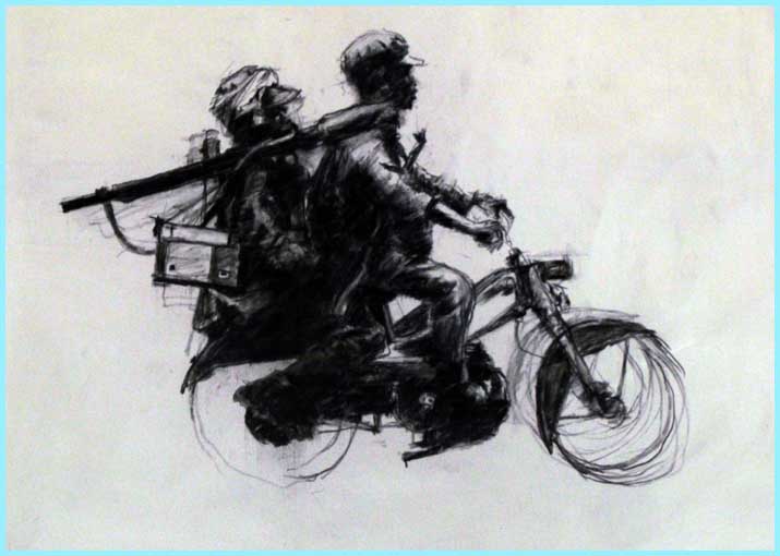 Les motocyclistes par Belkacem Boudjellouli (fusain)
