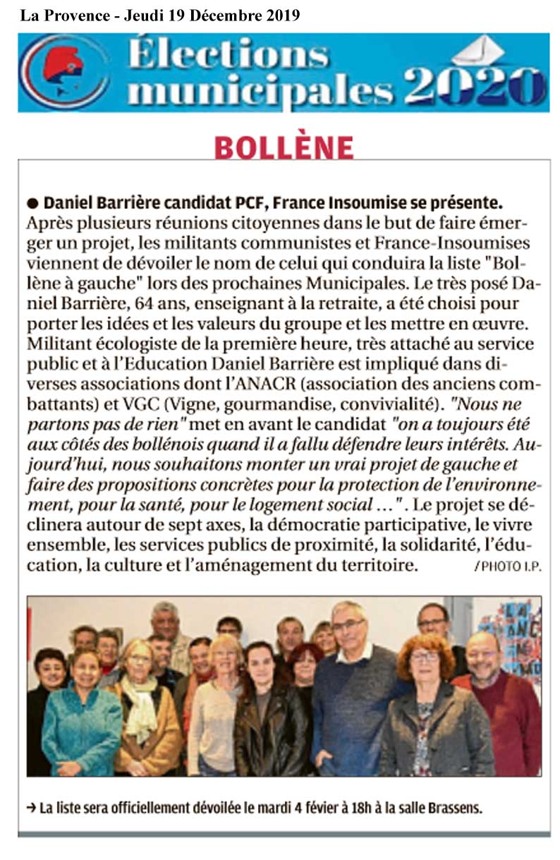 Le mois dernier apparaissait la liste « Bollène à gauche », dirigée par Daniel Barrière, candidat PCF qui, ce vendredi soir, inaugurait son local de campagne, situé rue Anatole-France. Devant de nombreux sympathisants, il a défendu « un projet novateur et bouillonnant comme aucun autre à ses yeux, selon une gauche résolue, et non la gauche caviar. » Trois militants sont intervenus à ses côtés.