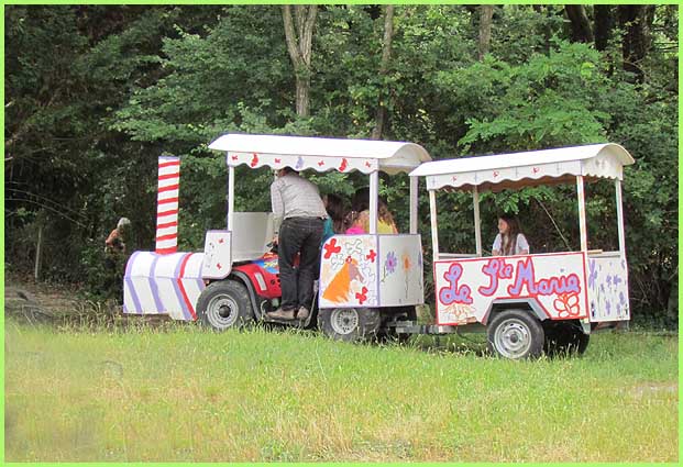 Divers stands et des jeux pour enfants encadrent le périmètre des festivités, d’où débordent les parties de pétanque et le circuit délicieusement chaotique du petit train « Sainte-Marie » à travers le parc.