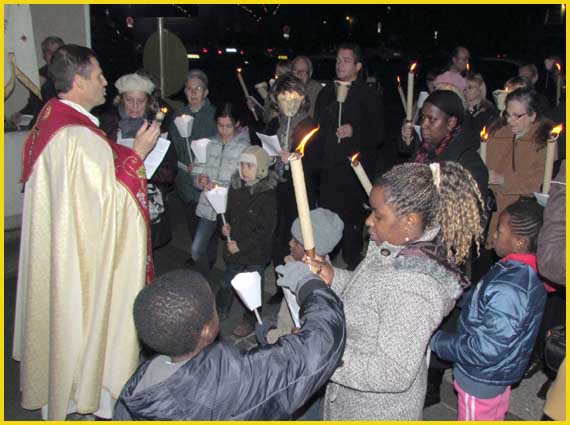 Mis sens dessus dessous, ce jeudi soir, le presbytère est le théâtre d’une joyeuse animation. Rien là d’impie, bien au contraire. Des ouailles de tous âges s’affairent autour des pères et Lelièvre qui revêtent leur chasuble d’apparat, tandis que sont distribués des cierges, allumés un à un au sortir de la cure.