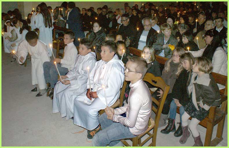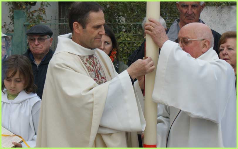 Imperturbable et secondé par son diacre Guy Humbel, M. le curé a cependant déployé certain faste : un rassemblement à l’extérieur autour d’un fagot de bois enflammé, puis d’un grand cierge à l’effigie du Christ. La flamme était aussitôt démultipliée par autant de mini-cierges individuels distribués par les enfants. Une courte procession aboutira ensuite à l’entrée de l’église où sera proclamée la résurrection du Christ. Le baptême de quatre enfants et d’un adulte marqueront encore cet épisode biblique.