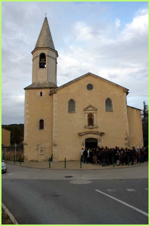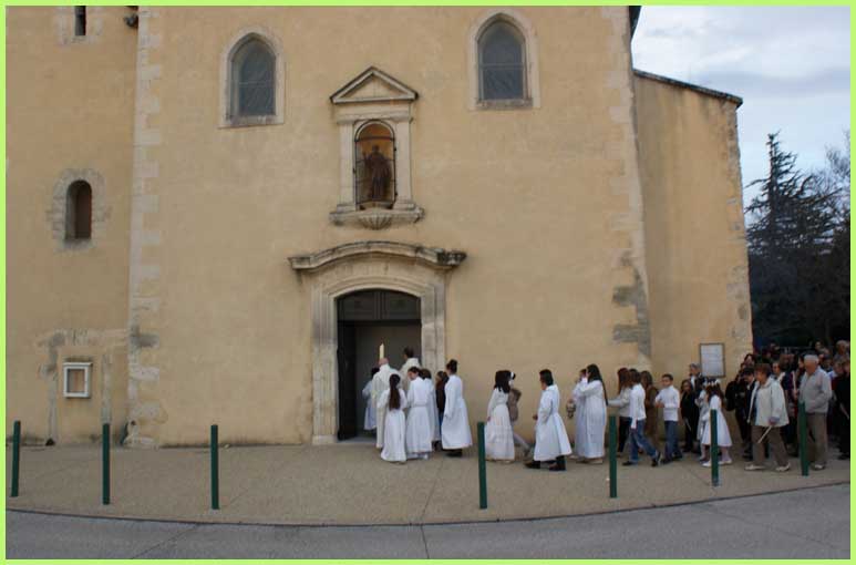 Cette pluie fine et persistante n’était guère engageante pour les Rameaux, initialement prévus selon le rituel suivant : rassemblement des enfants sur la place du 18 Juin, puis procession et messe célébrée sous le préau de l’école Sainte-Marie. .