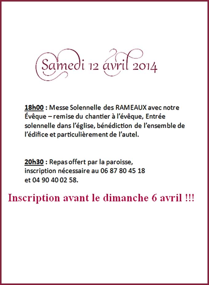 Samedi 12 Avril prochain : bénédiction par l'évêque et repas offert par la paroisse