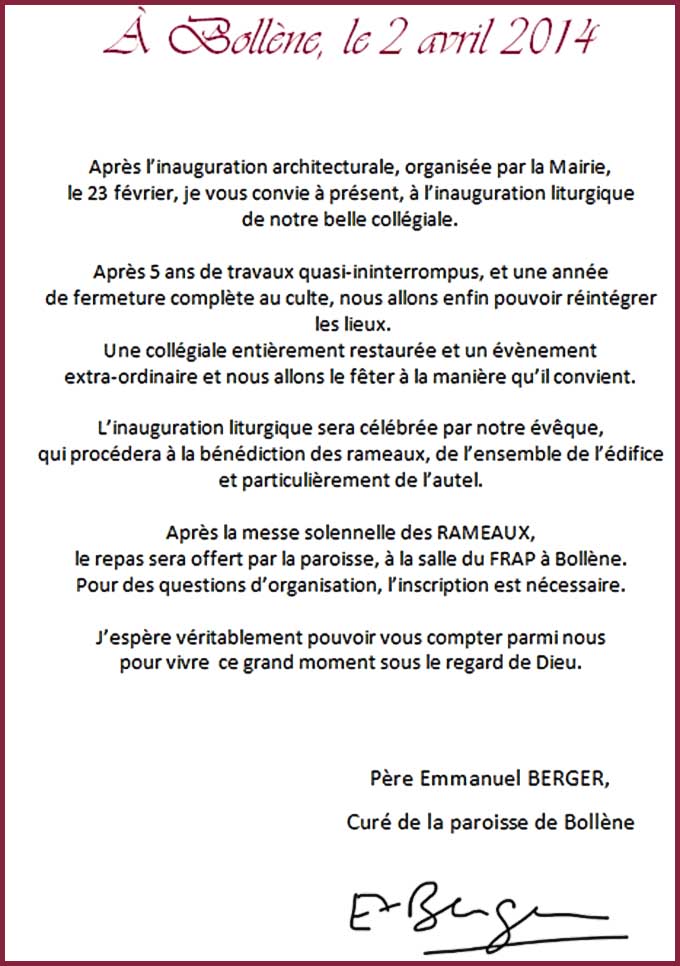 M. le curé se félicite, aujourd’hui, de pouvoir réintégrer les lieux saints et adresse à ses ouailles ce message : « La collégiale entièrement restaurée est un événement extraordinaire. Nous allons le fêter de la manière qu’il convient. L’inauguration liturgique sera célébrée par notre évêque qui procèdera à la bénédiction des rameaux, de l’ensemble de l’édifice et, particulièrement, de l’autel. Après la messe solennelle des rameaux, un repas sera offert par la paroisse à la salle du FRAP de Saint-Pierre de Bollène. Je souhaite vous compter parmi nous pour vivre ce grand moment sous le regard de Dieu. »
