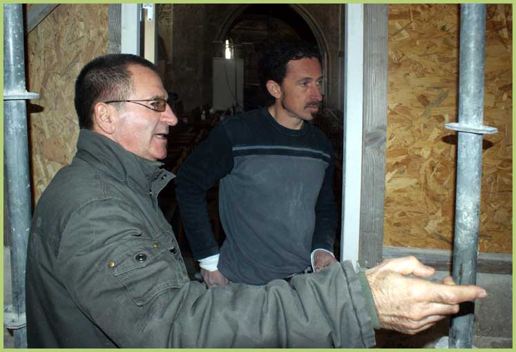 Claude Raoux, adjoint au patrimoine, et Fabien, chef de chantier, m'ont baladé dans les travaux labyrinthiques. Le remplage (à droite) a l'air de prendre son envol...
