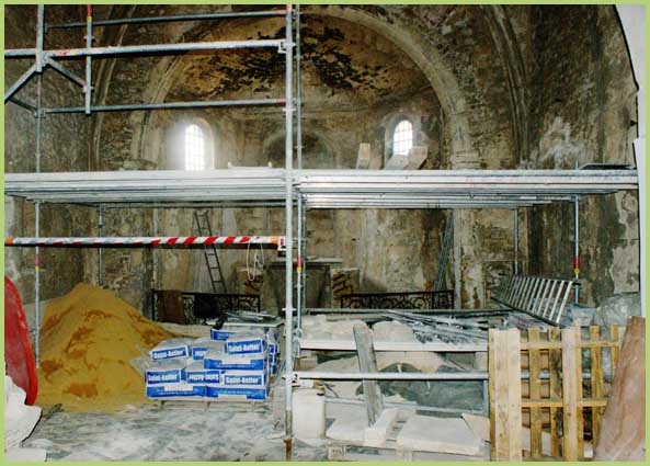 Aujourd’hui, trois ou quatre chapelles sont en chantier. Ici, manque  provisoirement un autel. Là, un retable. Deux maçons, Thomas et Hamadi, redressent une voûte à coups de truelle. Des statues dérangées président dignement le pieux désordre qui, selon M. le curé, « désclérose les vieilles habitudes. »