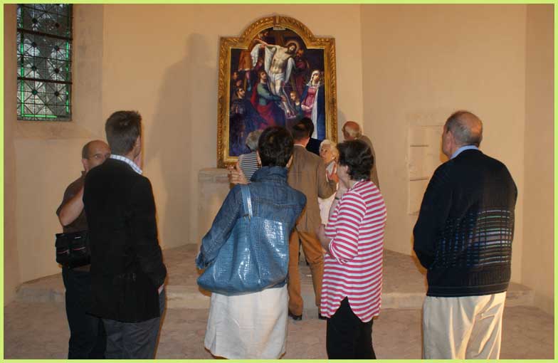 M. le curé en a commenté le sens, évoquant, d’une part, Sainte-Thérèse donnant le rosaire à Saint Dominique, et, d’autre part, Saint-Jean Baptiste récupérant Jésus crucifié tombé de la croix, devant Marie en proie aux sept douleurs.