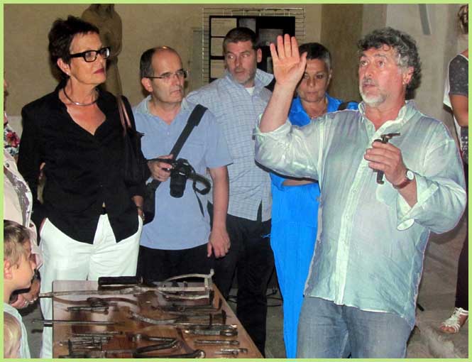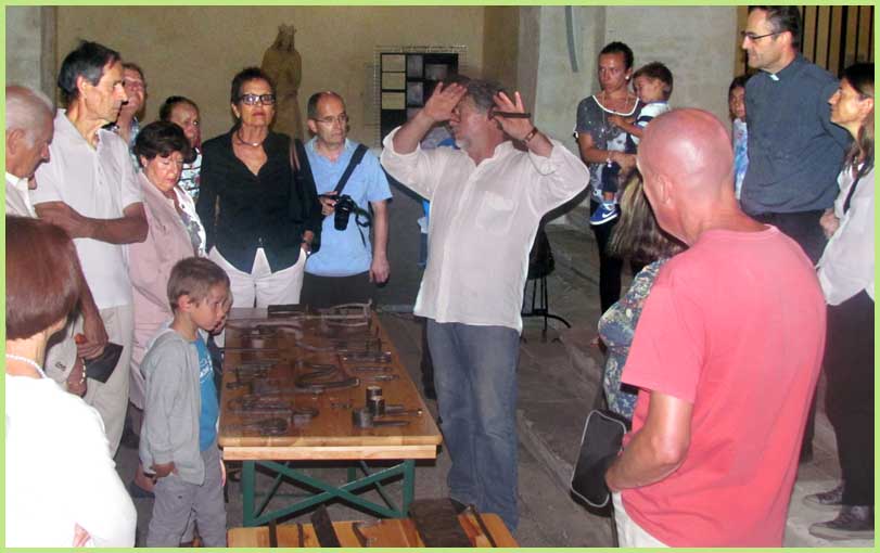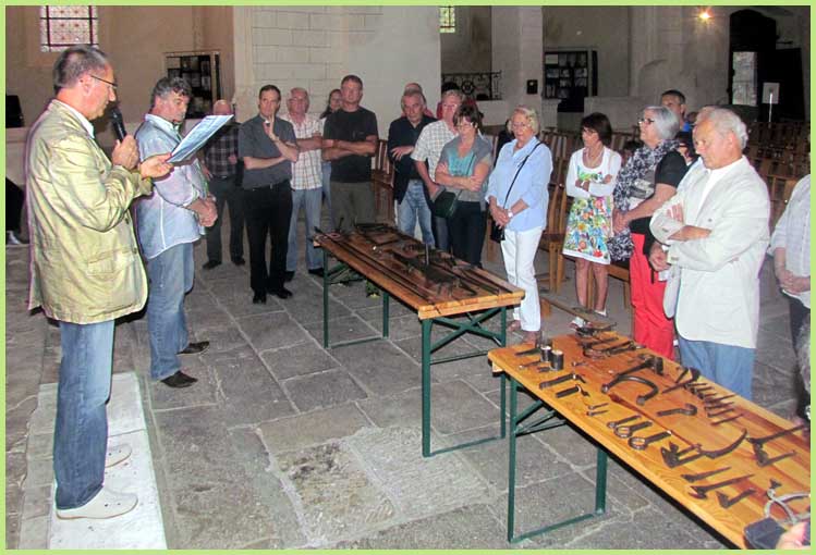 Suivait une savante démonstration par Jean-Claude Prunaretty, artisan maître de la Forge des Vertes Rives (Entraigues), venu parler avec passion de son métier. La rénovation de la collégiale a bénéficié de ses propres réalisations, dont un superbe portail en fer forgé clôturant une chapelle intérieure. Devant un étalage de pièces anciennes, il a évoqué le travail des forgerons à travers les âges, pour une assistance attentive dont M. le curé, particulièrement captivé. Un vin d’honneur a conclu cette intéressante remontre, qui précédait le week-end patrimonial. A suivre, donc…
