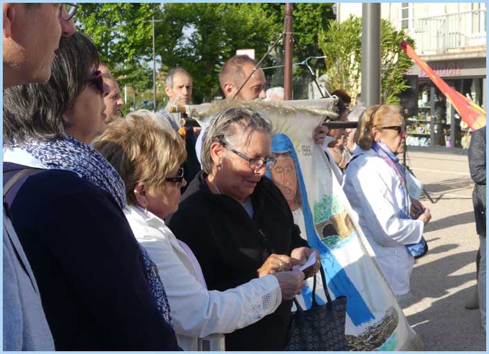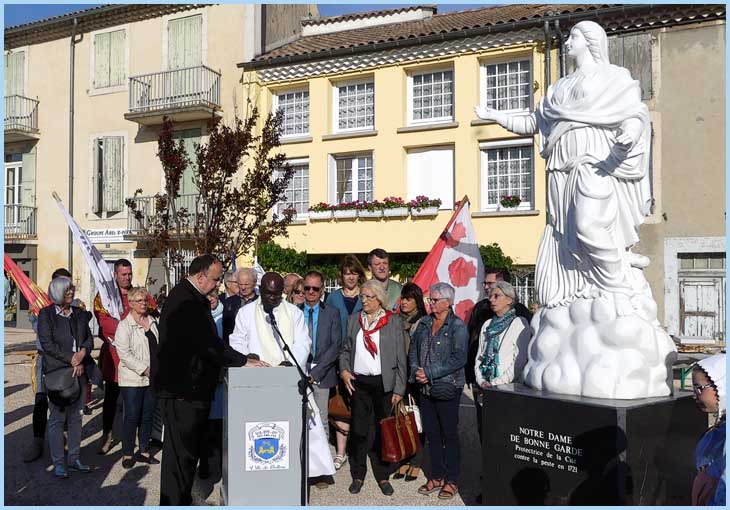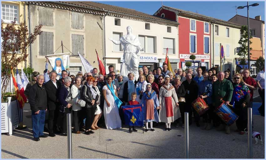 Marie-Claude Bompard, maire, ajoutait : « Quelle joie de voir la Vierge Marie retrouver l’espace public où elle a trôné durant des siècles ! Quelques esprits chagrins ont tenté une polémique. Or cette statue fait partie du patrimoine commun. Son histoire est l’hommage des habitants épargnés par la peste. Chaque année, en juin, nous renouvelons la consécration de la ville au Sacré-Cœur. »          J. P.