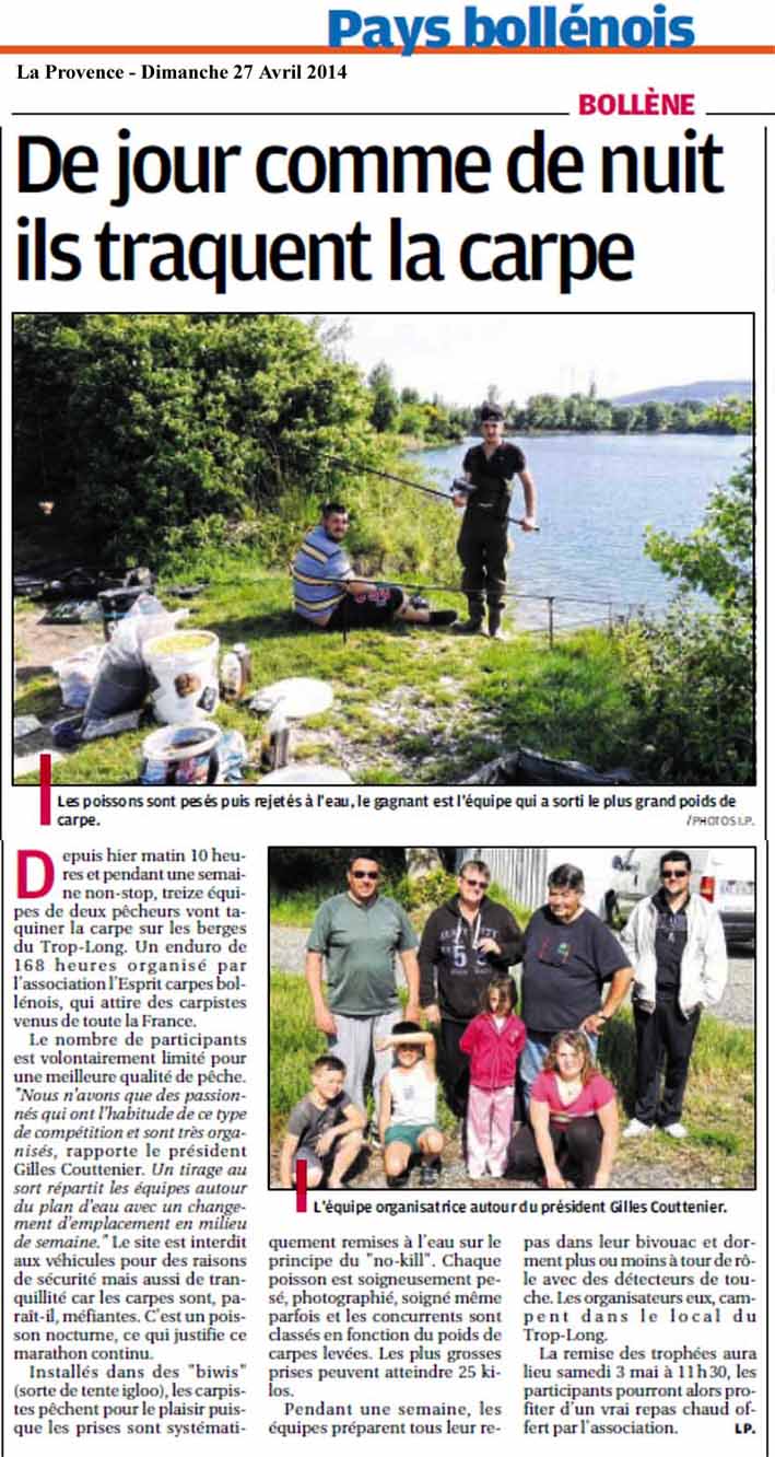 Créée voici quatre ans, l’association « L’Esprit Carpe Bollénois » (ECB) siège sur la berge du lac du Trop Long, où vient de se conclure son second challenge interne non-stop de pêche à la carpe, ouvert jour et nuit du 26 avril au 3 mai aux concurrents de l’Hexagone (voir article presse Isabelle Penon).