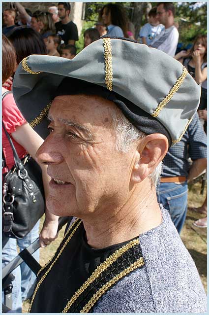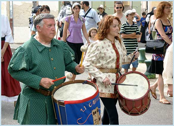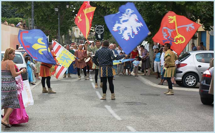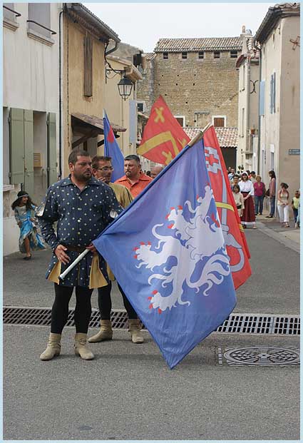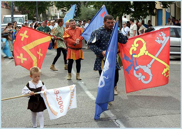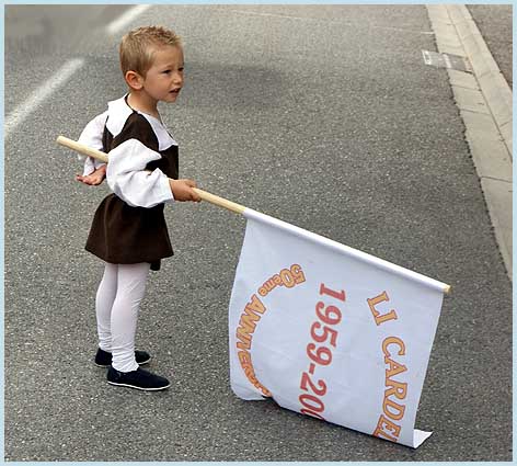 Les lanceurs de drapeaux (Li Cardelina) rehaussent le défilé. Vous remarquerez la relève (à droite) : Jules, 4 ans... |