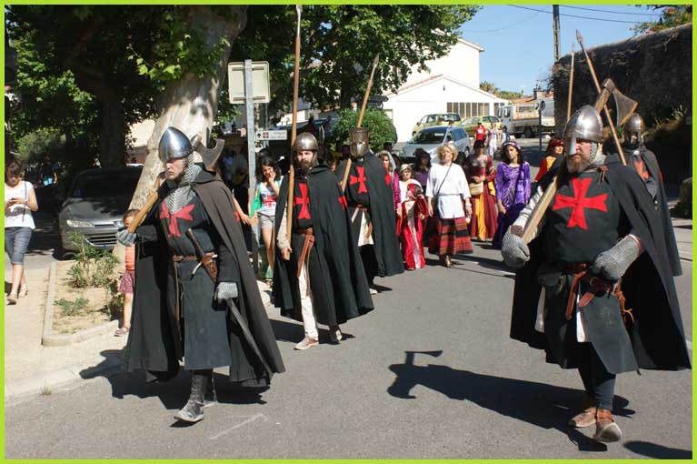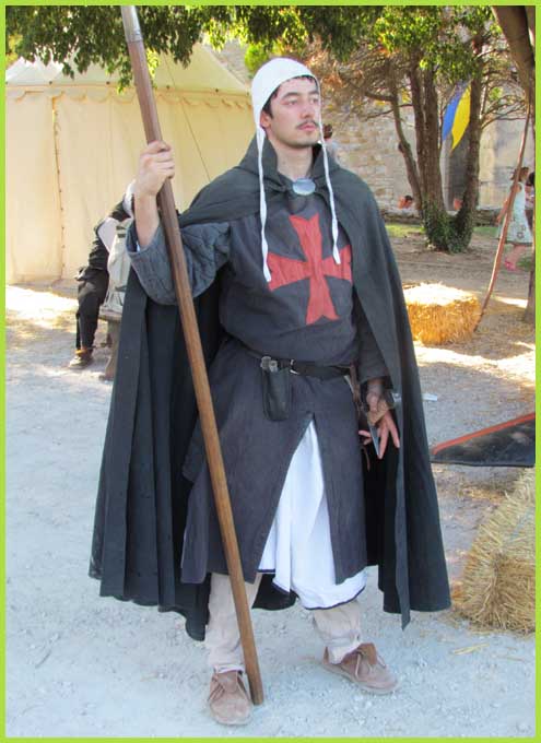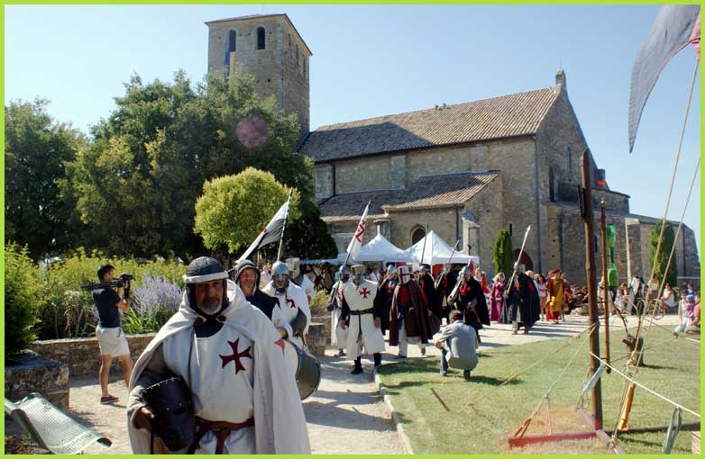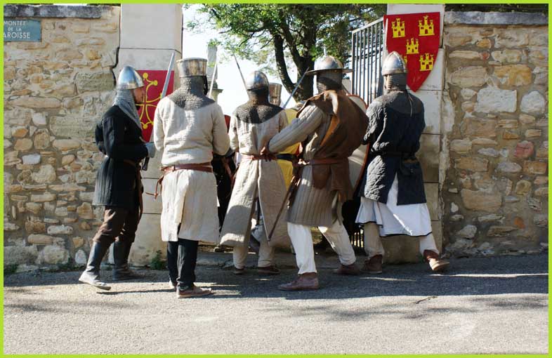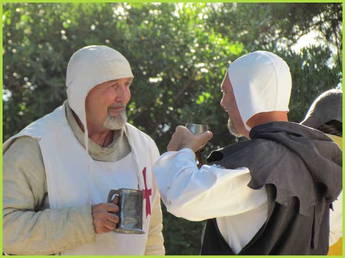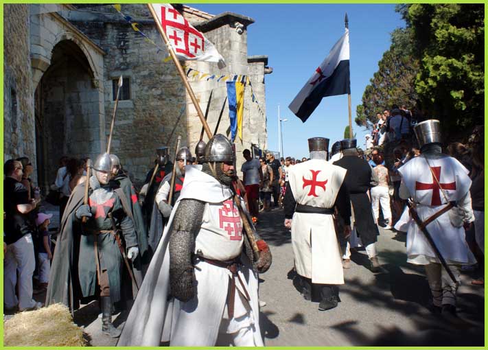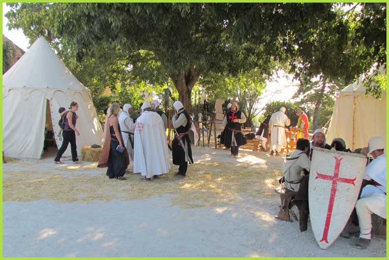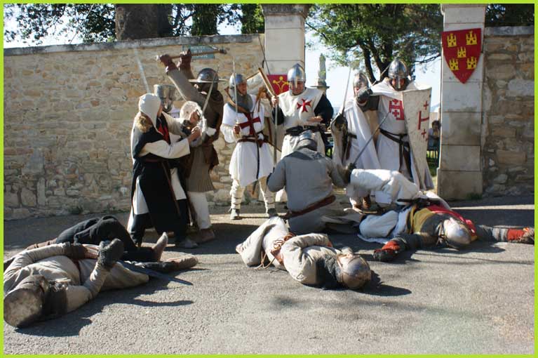 Les Templiers font mine de guerroyer. M'man, j'ai peur ! Mais non, bonhomme, c'est pour rire...