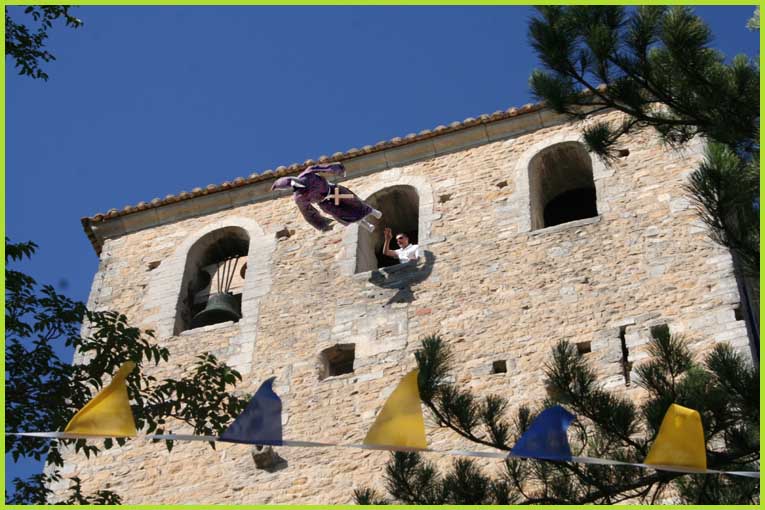 La Compagnie Vendaqui a fait un bond en arrière de huit siècles. D’où l’irruption du belliqueux Comte de Toulouse. Des moines damnés ont été jetés du haut du beffroi de la collégiale. Mais le camp des Templiers veillait à vaincre l’intrus. Les loups du Castel ont superbement dansé. L’enclave moyenâgeuse battait son plein.