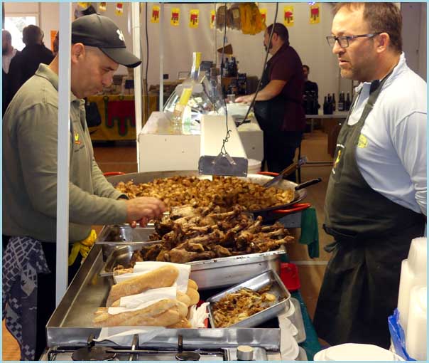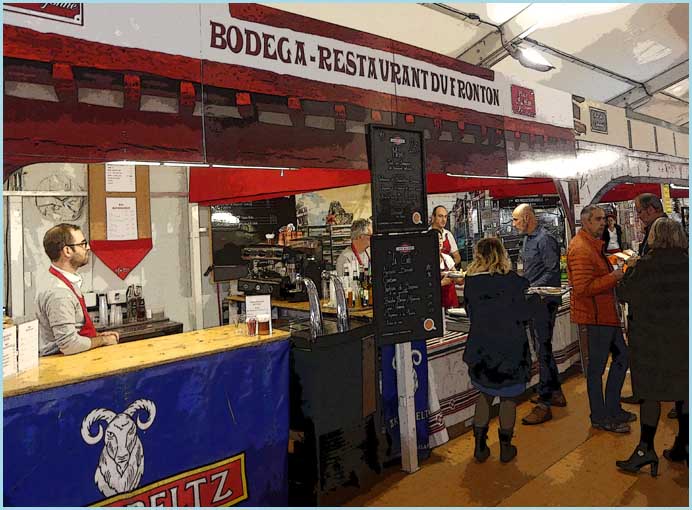La plus importante est celle du pays basque, invité d’honneur du cru 2018. L’étal fait partie intégrante du Restaurant du Fronton et se nomme bodega. Ce terme occitan désigne aussi un instrument de musique, cousin de la cornemuse. En Espagne, c’est un entrepôt où s’élabore le vin. En Amérique hispanophile, c’est encore un épicerie de proximité… Bref, l’embrouillamini est sans limite. Privilégions l’identité culinaire. Preuve à l’appui, nous nous y sommes régalés de spécialités basques, servies par des hôtes affables.
