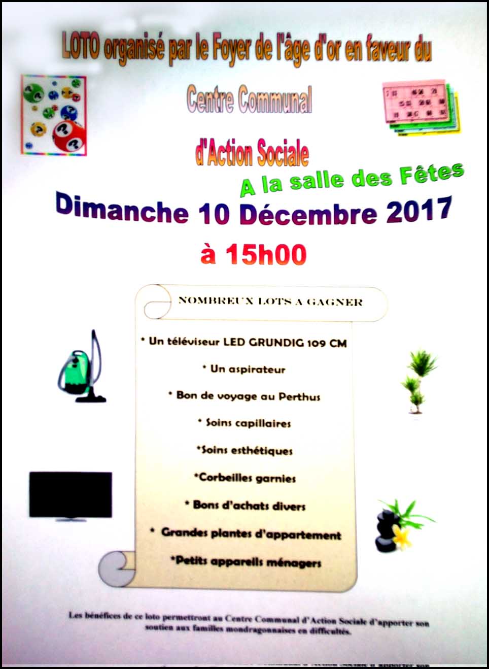 dimanche 10 décembre à partir de 15h à la salle des fêtes, un loto au profit