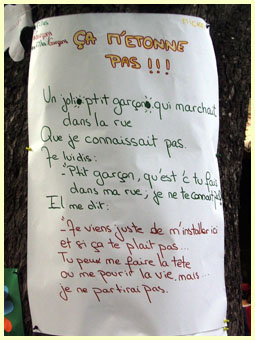 Comme toujours Les paroles d'une chanson sont affichées sur les troncs d'arbre... Voyons cela ! |