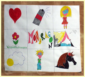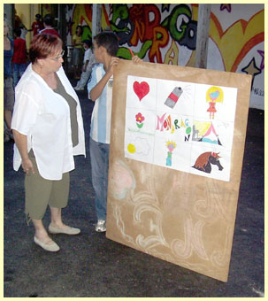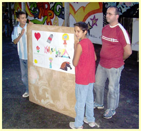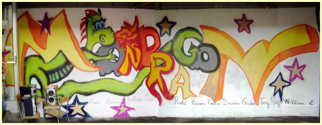 La fresque est terminée à temps pour décorer la fête. Elle déborde du projet initial. C'est tendance post-médiévale mâtinée futuriste. Il s'agit d' une oeuvre collective. Tout le monde a signé. Ce décor est indélébile et survivra longtemps |