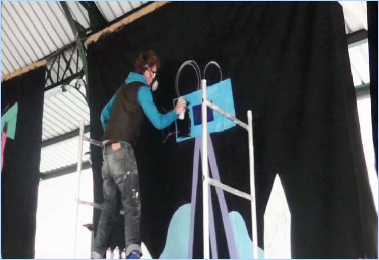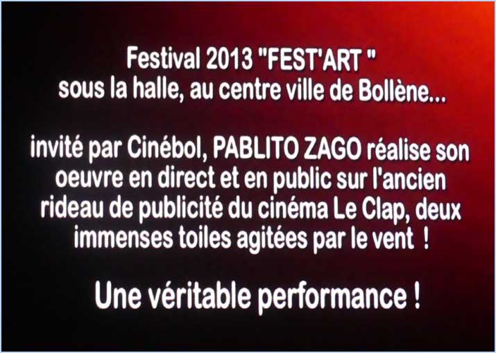 Déjà, en 2013, Cinébol accueillait Pablito Zago, artiste avignonnais pluridisciplinaire qui se distingue notamment par des fresques sur les murs. Pour la salle du cinéma Le Clap, il réalise alors une composition géante qui servira de rideau dissimulant l’écran durant l’entracte.