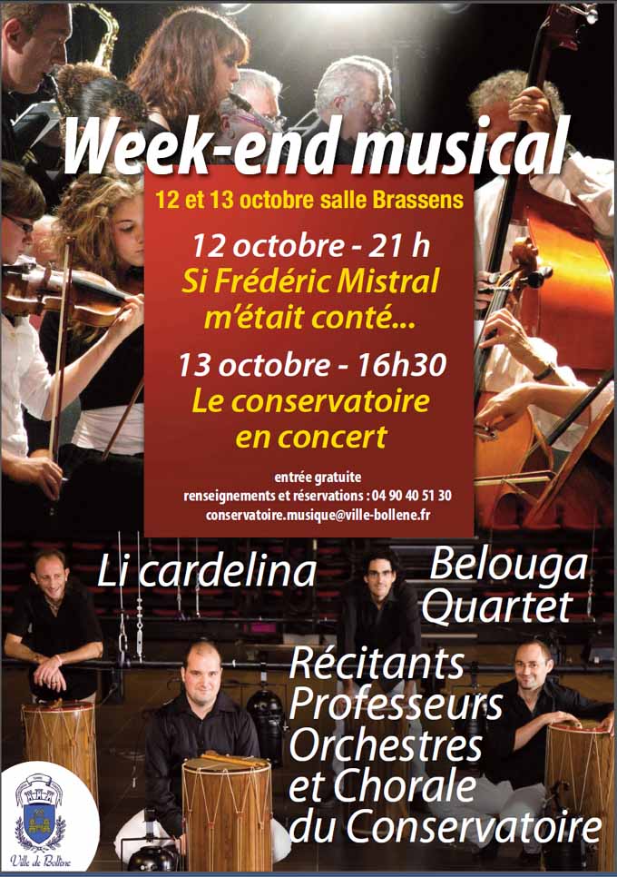 Chaque automne est désormais marqué par un week-end musical, proposé par le Conservatoire de Bollène. L’événement comporte deux volets, présentés à la salle Brassens.