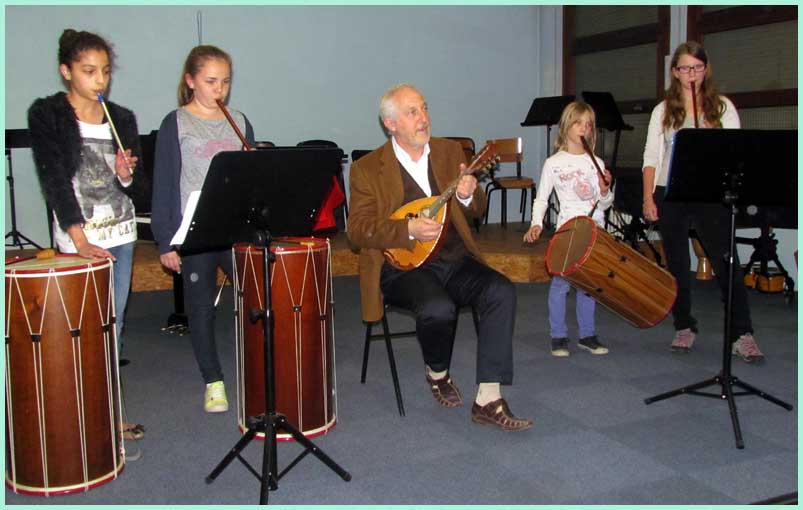 Patrice Conte (au centre) et son atelier galoubet-tambourin.