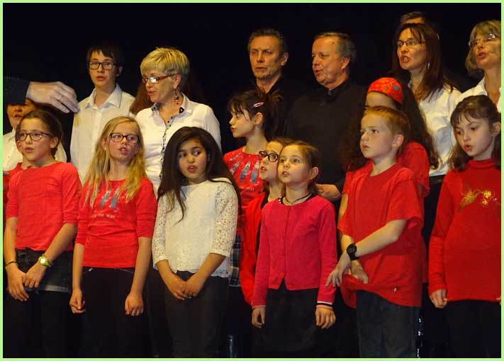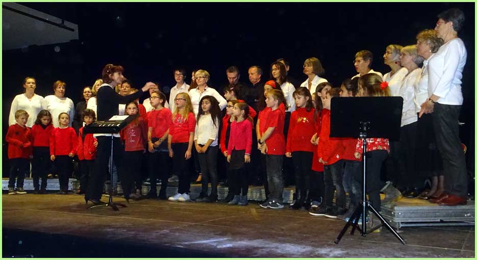 Après l’entracte et la buvette de l’APE, un trio (deux violons et un piano) ont fort bien joué Beethoven (contredanses). L’orchestre à cordes (initiation) a ravi l’auditoire avec un canon (Pachelbel) et Douce nuit. Mention spéciale pour l’ensemble à cordes qui a superbement servi Vivaldi. Au final, l’atelier voix (adultes) et la chorale enfants, très applaudis, ont conclu en chantant Noël.                J. P.