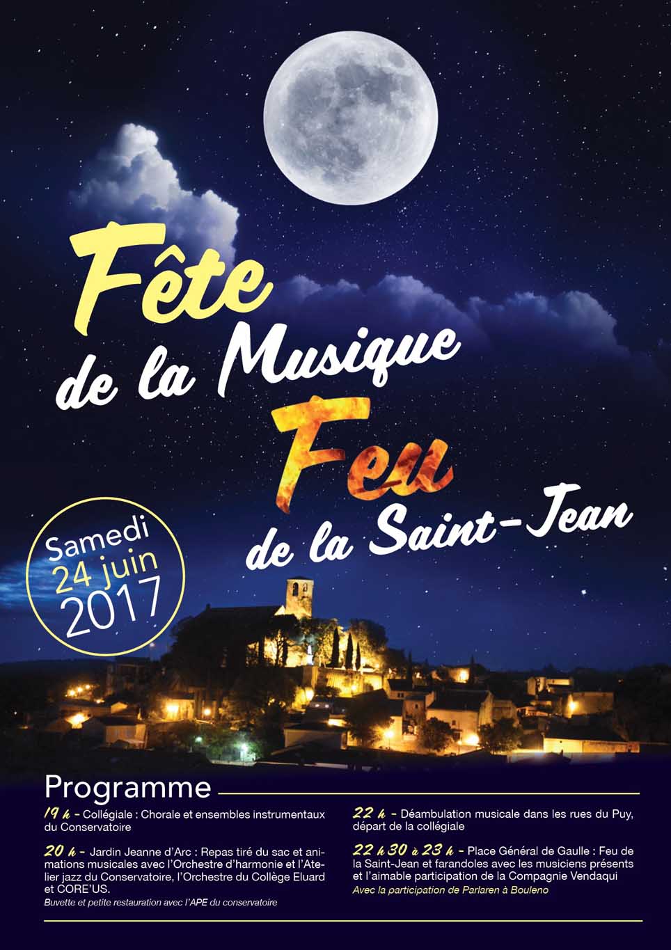 Avec la participation de l’association Parlaren à Bouleno, ce samedi 24 juin, le Conservatoire organisera la fête de la musique et le feu de la Saint-Jean qui coïncideront et animeront la haute ville. Au programme à 19h dans la collégiale : chorale et ensembles instrumentaux, à 20h dans je jardin Jeanne d’Arc : repas tiré du sac et animations musicales (harmonie, atelier jazz, orchestre du collège Eluard et Core’Us), à 22h : déambulation musicale dans les rues du Puy, à 22h30 place du Général de Gaule : feu de la Saint-jean et farandoles avec les musiciens dont ceux de la Compagnie Vendaqui.