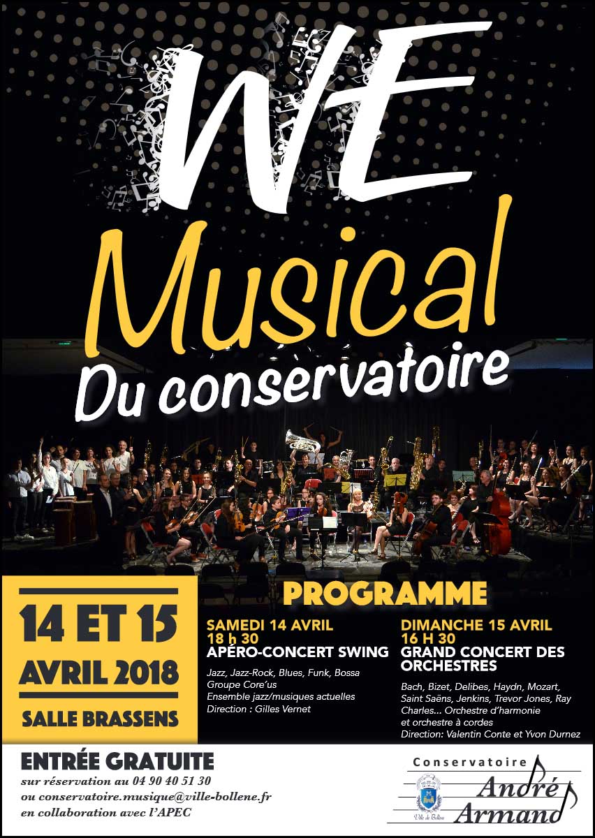 Programme co-organisé avec l’association des parents d’élèves (APE) avec des œuvres de J. S. Bach, Bizet, Delibes, Haydn, Mozart, Saint-Saëns, Jennys, Trevor Jones et Ray Charles. Entrée gratuites sur réservations, Tel. 04.90.40.51.30 ou conservatoire.musique@ville-bollene.fr    Affiche