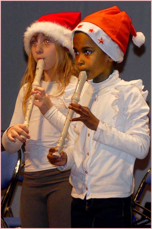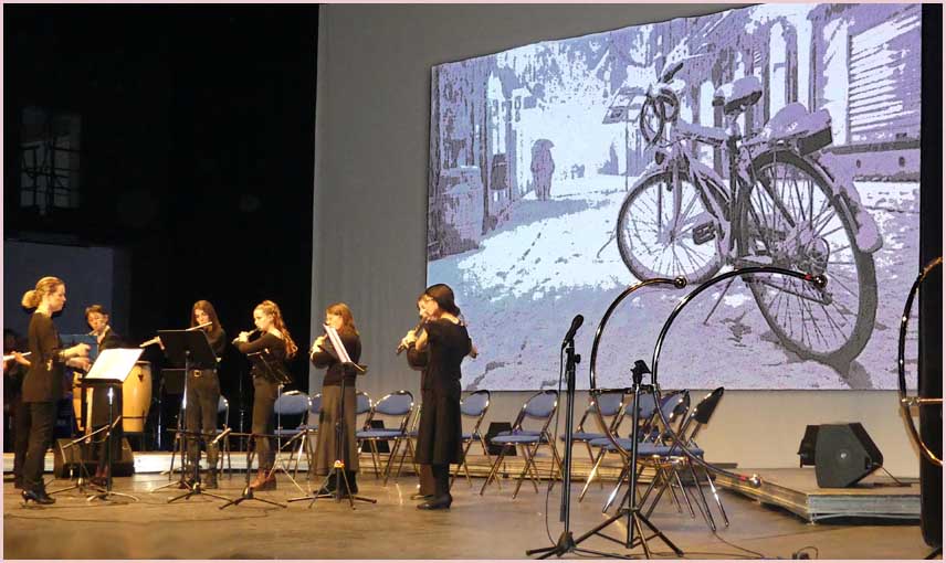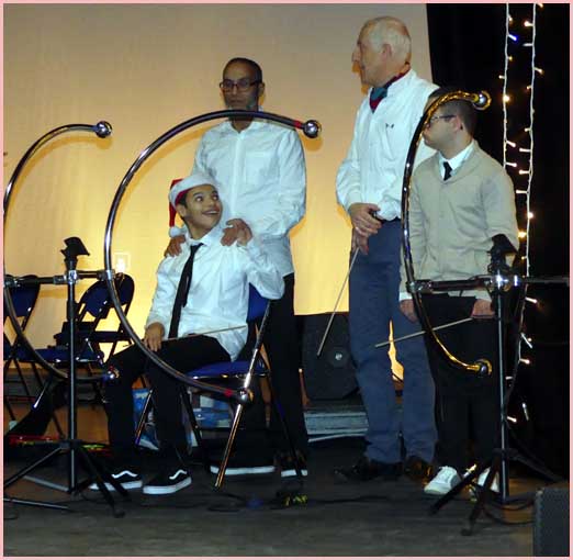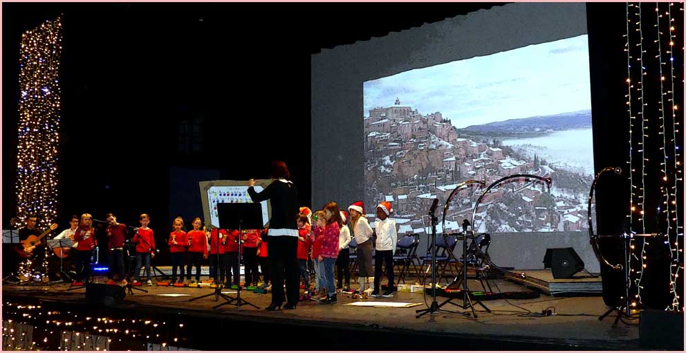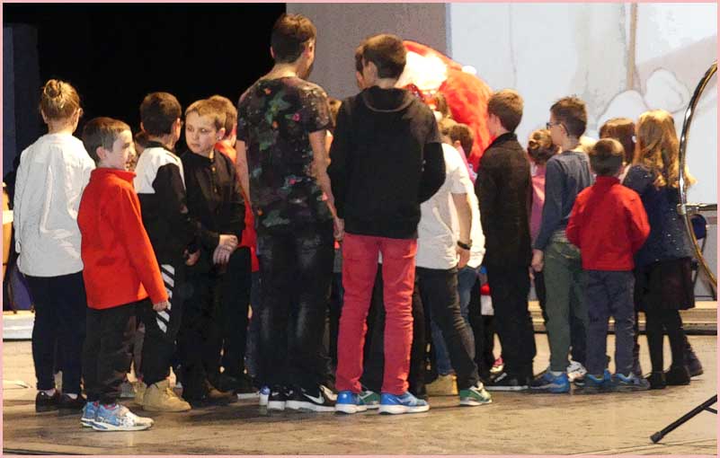 Face aux gradins, qui ont fait le plein, une vue plongeante sur la scène portait sur une file ininterrompue d’exécutants. Rappelons que le conservatoire en compte 300 de tous âges, encadrés par une quinzaine de professeurs. Une bonne moitié de l’effectif était sur scène ce soir-là. En toile de fond, sur un grand écran, un diaporama égrenait une série d’images sur le thème de l’hiver et de Noël. Quel superbe dispositif, encore enjolivé par l’arrivée du Père Noël !