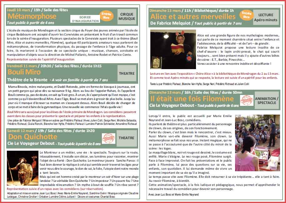 Dimanche 13 mars à 11h à la bibliothèque municipale : « Alice et autres merveilles » de Fabrice Melquiot. Lecture « Apéro minots ». Même jour à 16h salle des fêtes : « Il était une fois Filomène », par la Compagnie Le Voyageur Debout.