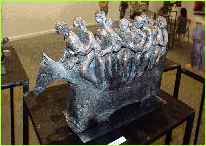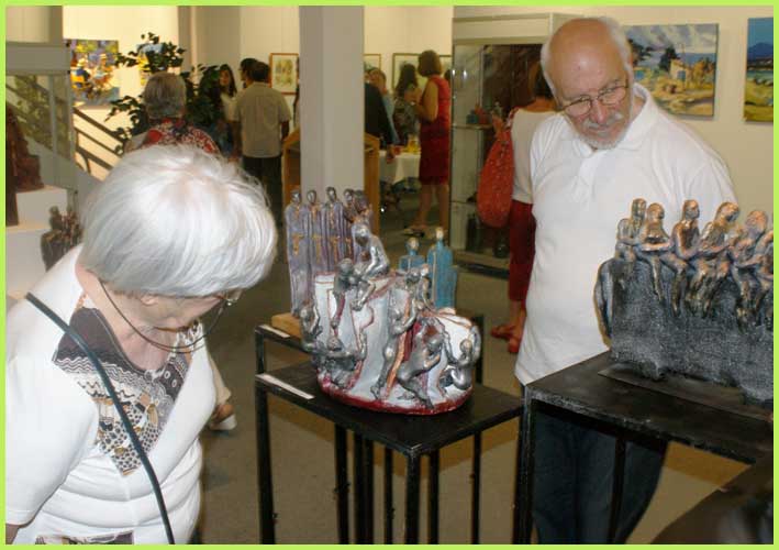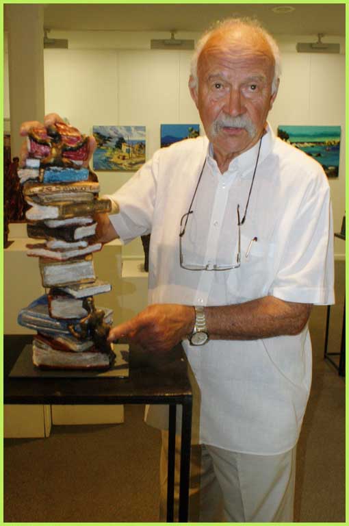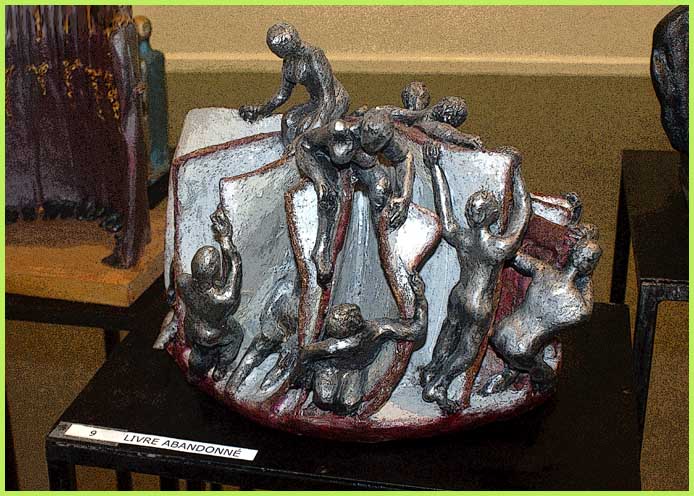 En témoigne une série d’œuvres cuites au four à 1200 degrés, où l’humour le dispute au fantastique. Une kyrielle de personnages débridés escalade un mur, dégringole d’un escalier, s’échappe des pages d’une colonne de livres. Une femme boule fait des grâces. Un couple goûte au baiser tango… Quel enchantement ! L’artiste se dit « récompensé par le regard des autres. » Pour sûr, il l’est au travers de nombreux  salons qui l’accueillent en France !