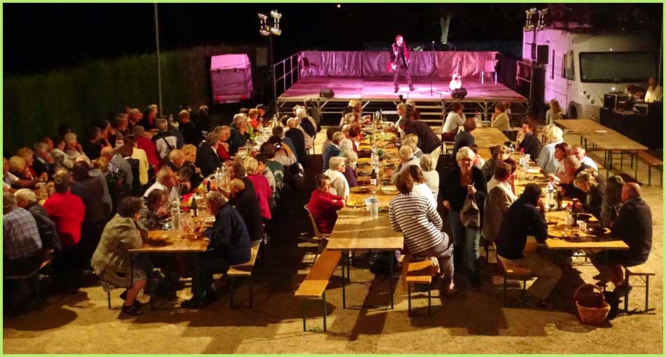 Qu’importe ! Les 130 convives ont stoïquement dégusté une excellente paella, suivie d’un extraordinaire music-hall, animé par Pascal Fallais, meneur de revues proposées par la Société Alfa Spectacles. Une première partie était assurée par le duo de charme de la chanson française, Mary et Didier (chant et guitare). La suite, d’un inénarrable transformisme, mettait en scène Amanda et sa troupe. A suivre…       J. P.