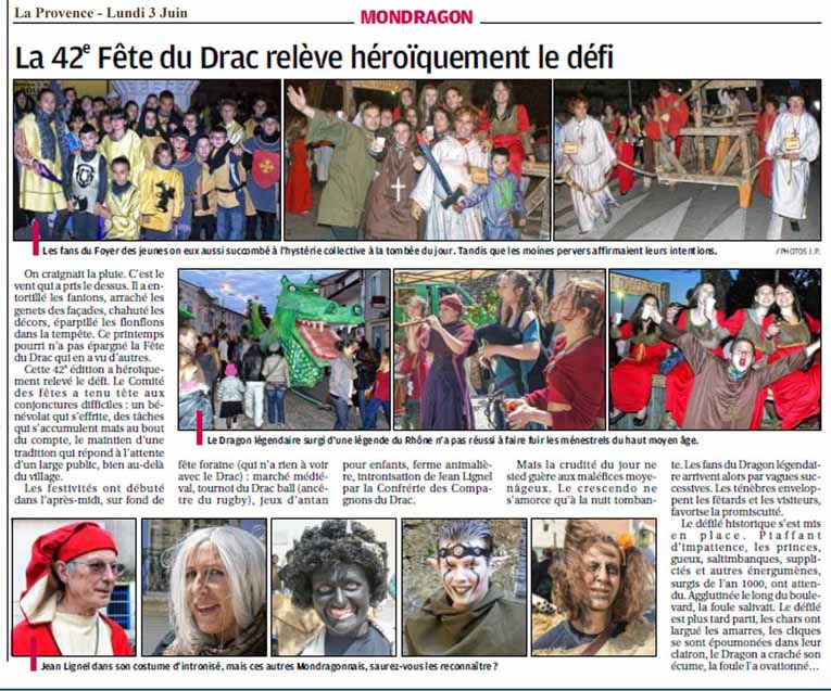 Les festivités ont débuté dans l’après-midi, sur fond de fête foraine (qui n’a rien à voir avec le Drac) : marché médiéval, tournoi du Drac ball (ancêtre du rugby), jeux d’antan pour enfants, ferme animalière, intronisation de Jean Lignel par la Confrérie des Compagnons du Drac.