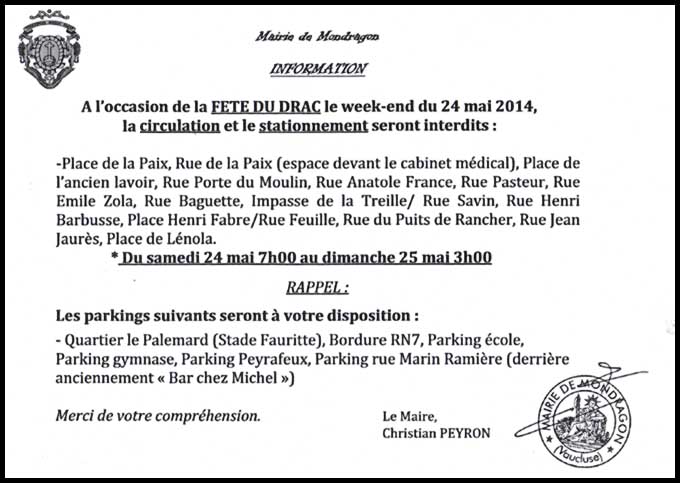 Les festivités sont donc prévues pour samedi 24 mai à partir de 11 heures. Au programme : salon de peinture (Nuances), rétrospective photos (chapelle des Pénitents)*, ferme pédagogique, jeux d’antan pour enfants, Drac Ball (tournoi), animation des rues, marché médiéval, campement d’époque et ateliers divers, défilé nocturne costumé avec chars…